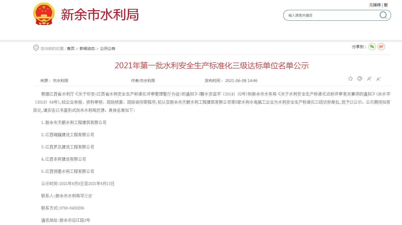 热烈祝贺我司于2021年7月被新余市水利局评为新余市水利安全生产标准化三级达标单位,证书编号:余水安标ⅢSG20210005。