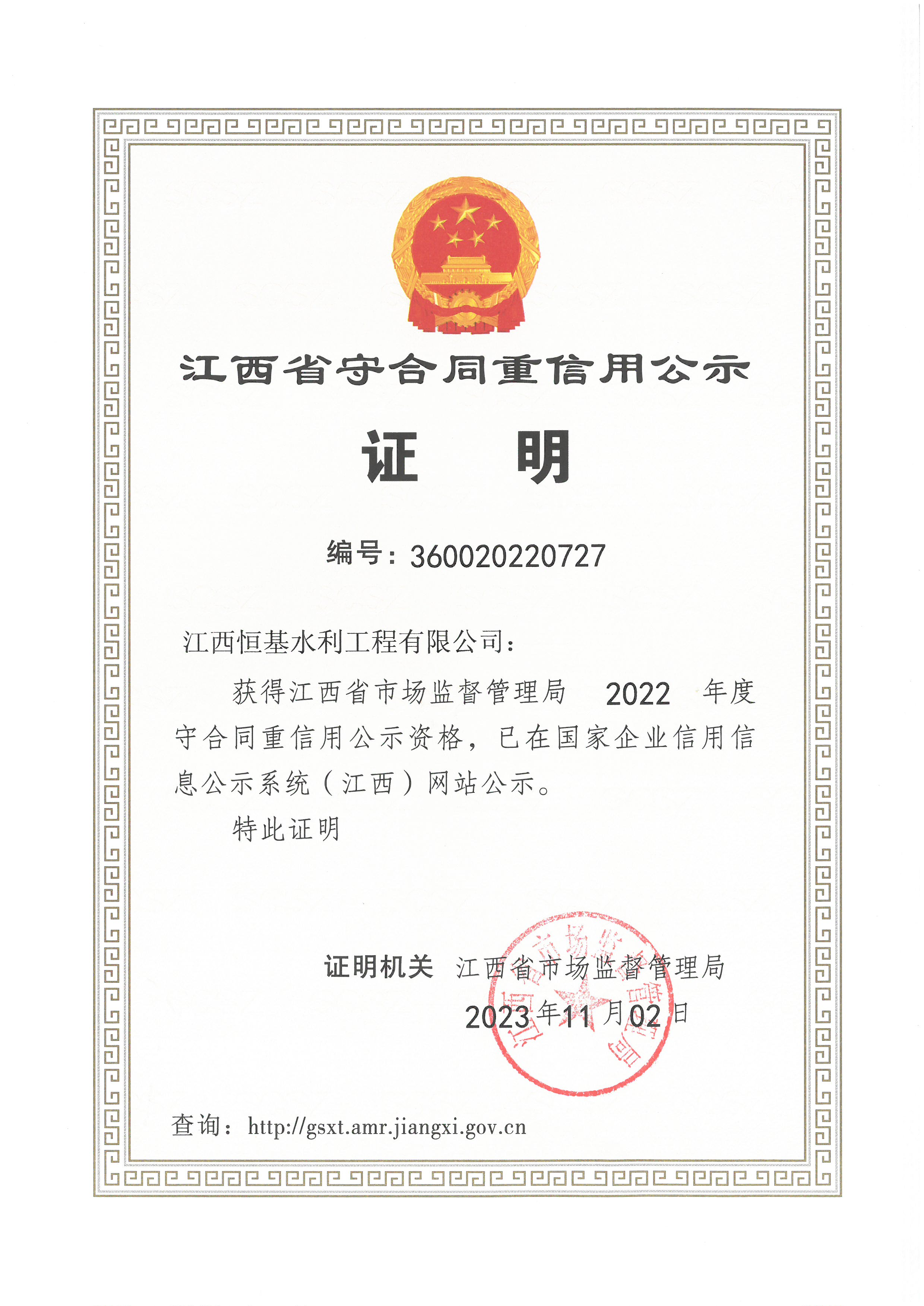 ——我公司获得江西省市场监督管理局2022年度“守合同重信用公示资格